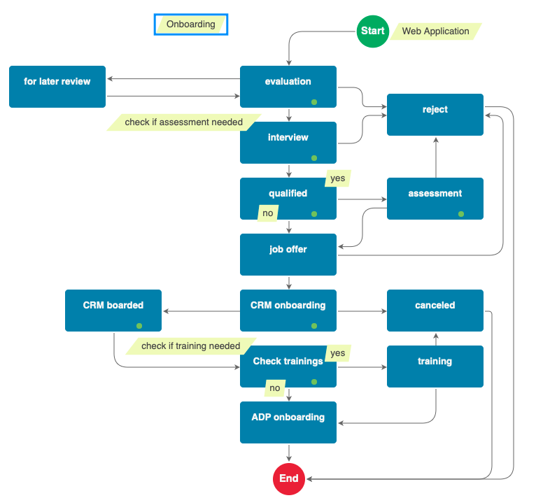 End-to-end hiring and onboarding flow: from online application to evaluation, offer, CRM onboarding, training, and activation in the system.