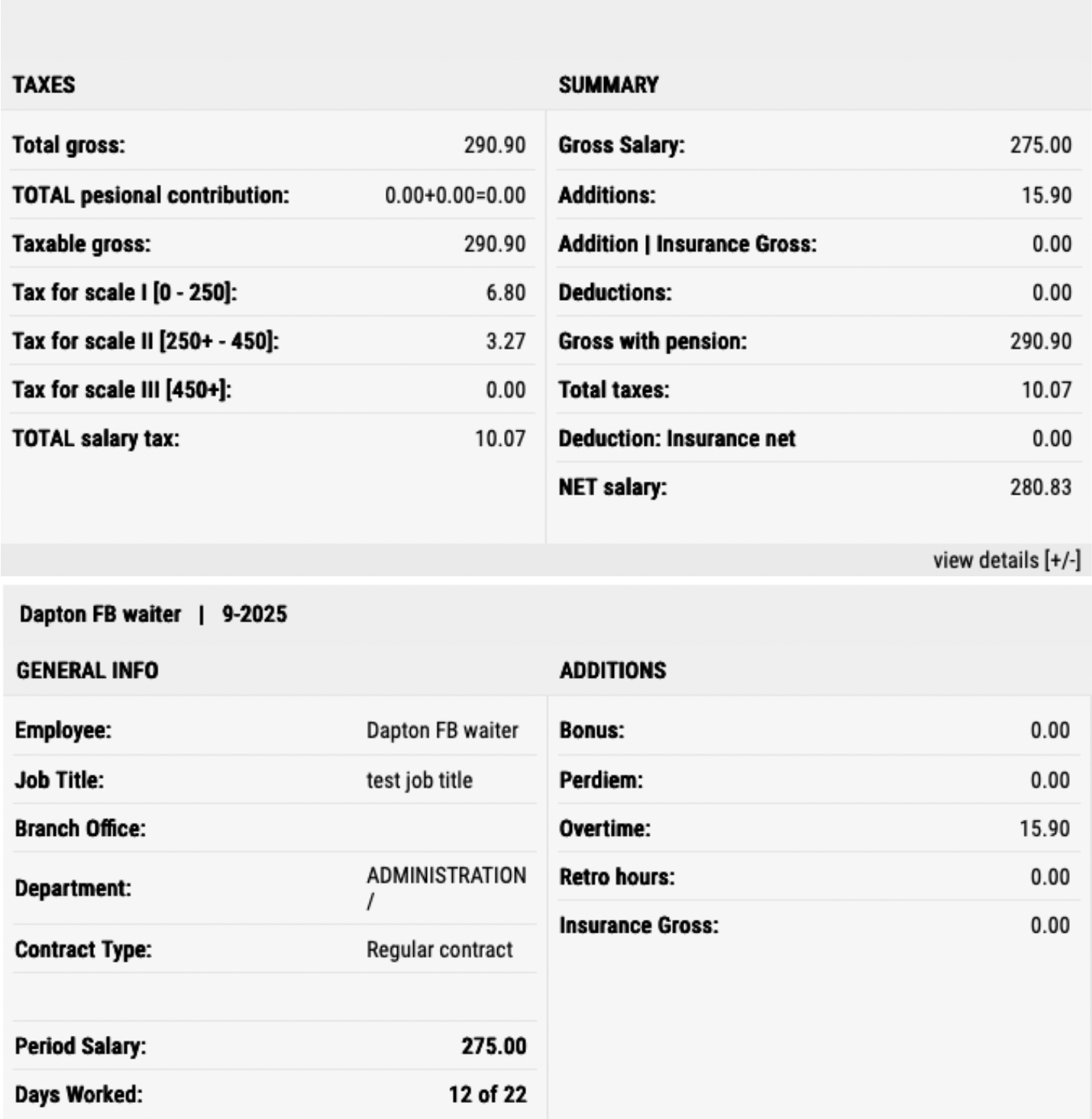 A detailed breakdown of an employee’s gross, taxes, additions, deductions, and final net salary for the selected period.